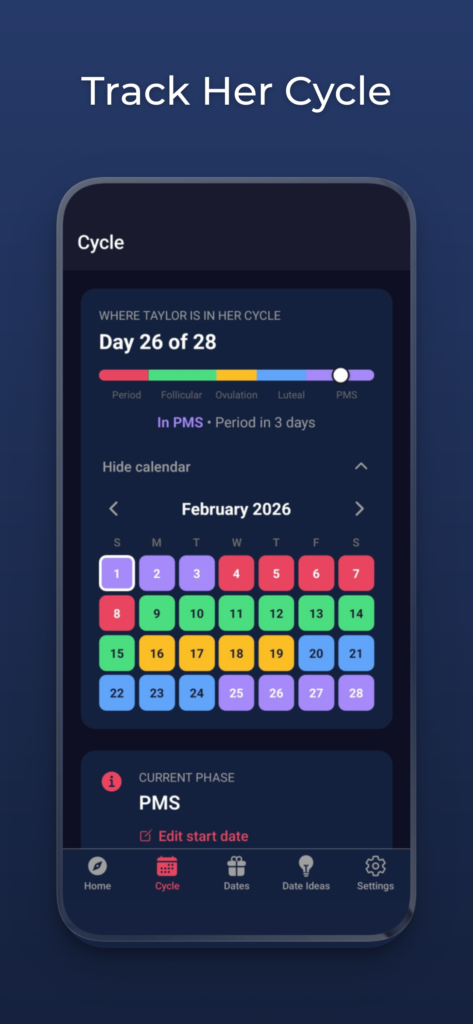 Your partner doesn’t have to share her personal tracking data. You simply ask her when her last period started and you get simplified cycle tracking. She maintains her privacy while you stay informed.